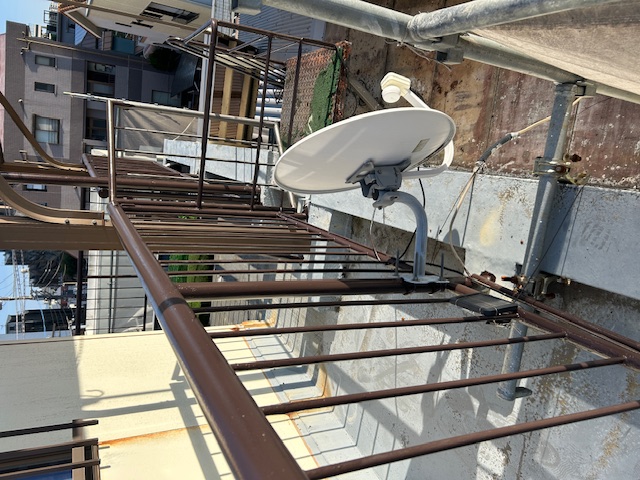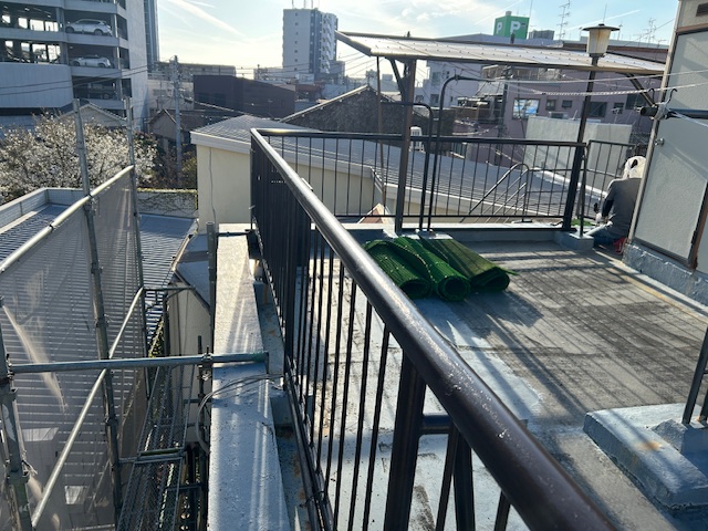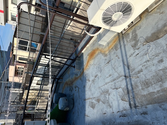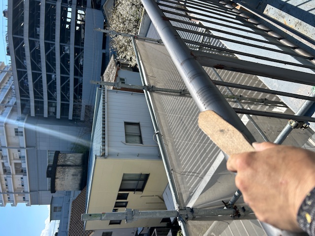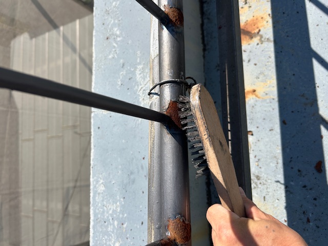 屋上の手摺は充分ケレンします。それから2液性の錆止め材で塗布します。