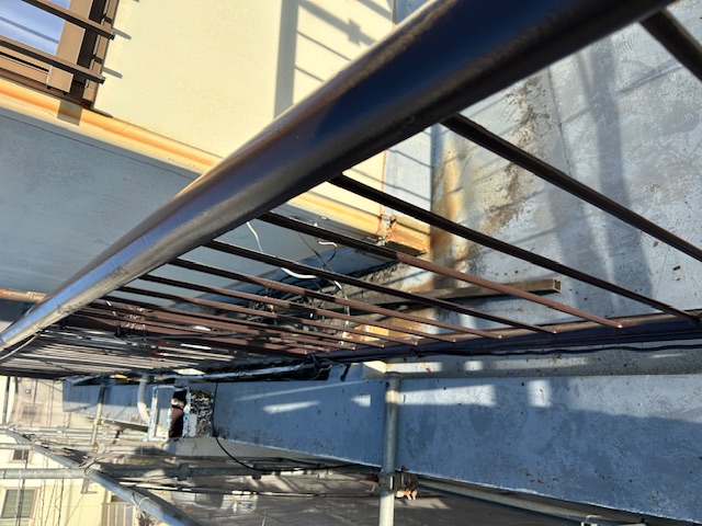 ②屋雨流れ両側既存屋根を撤去し2次防水下地の防水シートが切れていないかの確認し処理か?